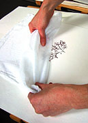 | When the press is completely dry, unload it and carefully uncover your pressed specimens When you are certain that the contents of your press are dry, unstack it from top to bottom. If you've been using a fan, make certain that it is off so that you don't blow away your work. As you go along, carefully remove the cheesecloth or other covering sheet from each specimen by peeling it off slowly from one edge. Take extra care near the edges of fine filamentous specimens, which sometimes tear or pull off the mounting paper. The edges of filamentous specimens are less likely to be damaged if you peel off the covering sheet from the center out, generally following the branches of the specimen from coarse to fine. |