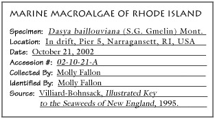 Store, trade, or display your specimens In scientific collections, specimens on standard-sized herbarium sheets are grouped into card-stock folders and stored in the dark in herbarium cabinets. Beautiful specimens have been preserved for hundreds of years under these conditions; however, not too many people get a chance to see them. Consider trading your specimens with professionals and enthusiasts from other areas. Trading specimens is common among professional herbaria, and helps to create collections with representative specimens from around the world. Professionals will expect that specimens be mounted on standard-sized herbarium sheets (11½ × 16½ inches [29 × 42 cm]), and labeled with accurate details about the collection site and conditions. You can also mount seaweeds less formally on note cards or in albums, a practice that was popular among Victorian ladies. Although seaweeds are pressed to preserve them, many pressed specimens are still fragile and most will fade if displayed for any length of time. Exposure to bright light or sunlight especially makes the colors in seaweeds fade. You can try to stabilize your specimens by coating them in clear acrylic or varnish, or by trying to laminate them in plastic, but these techniques can be tricky and yield only mixed results. If you do want to display your work, keep in mind that it will fade, and use this as an excuse to press some more! To preserve our original seaweed art, we have to work under strictly controlled conditions and employ a variety of proprietary techniques and treatments. Even if your work is stored in a folder on a shelf, you can still bring it out to show your friends, and its fugitive nature can make it an even more cherished treasure. |  |